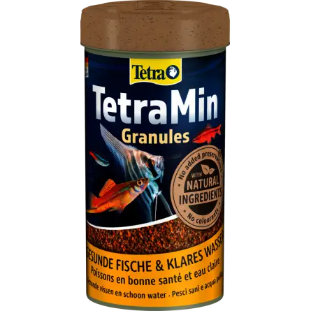 TetraMin Granulat bietet dank einer sorgfältig abgestimmten Kombination aus Fisch, pflanzlichen Proteinen, Ölen, Mineralien und Algen eine vollständige Nährstoffversorgung. Diese vielfältigen Inhaltsstoffe decken den essentiellen Nährstoffbedarf der Fische und unterstützen gleichzeitig ihre Energie und Entwicklung. Der hohe Rohproteingehalt trägt zu einem stetigen Wachstum und einem guten Allgemeinzustand bei.
