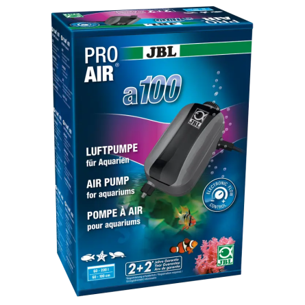 The JBL ProAir a100 is a compact air pump designed to provide gentle, stable, and quiet oxygenation for aquariums. With a flow rate of 100 l/h and a low power consumption of only 2.5 W , it is ideal for small tanks or as a reliable replacement for worn-out equipment. Delivered as a complete, ready-to-connect kit , it includes everything needed for immediate use. Its quiet operation is ensured by a sound-damping chamber , a reinforced body, and anti-vibration feet . The result: an efficient, quiet, and easy-to-use pump.