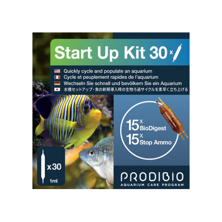 The PRODIBIO Start Up 30-ampoule version corresponds to the Standard range for aquariums from 360 to 1000 liters . It contains 15 ampoules of BioDigest Start and 15 ampoules of Stop Ammo Start. This packaging is ideal for large volumes, as it offers a complete, calibrated, and easy-to-use solution for a successful start-up or an ambitious renovation.