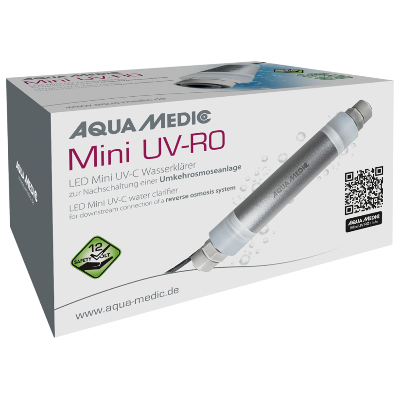 The AQUA-MEDIC Mini UV-RO is the perfect finishing touch for your reverse osmosis system. Thanks to its UV-C LED technology , it provides powerful, chemical-free disinfection of reverse osmosis water, eliminating up to 99.99% of germs and bacteria . Easy to install, immediately ready to use, and completely maintenance-free, it fits into the outlet of any reverse osmosis system. Compact yet formidable, it operates safely thanks to its integrated pressure relief valve and shielded aluminum housing . With a 10,000-hour LED life and ultra-low power consumption, it combines performance, durability, and simplicity.