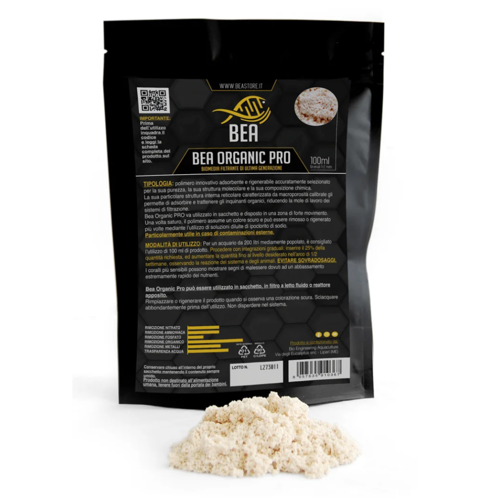 BEA Organic PRO 250 ml is a third-generation biomedia designed to effectively adsorb and retain organic pollutants in marine aquariums. Thanks to its cross-linked macroporous structure , this innovative polymer captures dissolved organic compounds and significantly reduces the workload of filtration systems. Presented as 1-2 mm granules and supplied with a convenient bag, it is easily placed in high-movement areas. 250 ml is sufficient to treat a 500-liter aquarium for up to 6 months. Regenerable multiple times, it offers a sustainable solution for maintaining clear, stable, and healthy water.