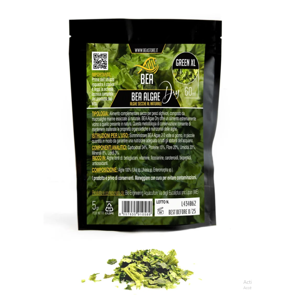 BEA - Algas Verdes Deshidratadas XL - 5 g es un alimento complementario 100 % vegetal , compuesto exclusivamente de macroalgas marinas deshidratadas naturalmente (Ulva, Ulvaria, Enteromorpha). Diseñado para peces algófilos como los peces cirujano (Acanthuridae), reproduce fielmente su dieta natural. Rico en fibra insoluble para favorecer la digestión, con un contenido proteico del 15 % al 20 % y carbohidratos de fácil digestión, contribuye a una dieta diaria equilibrada. Las algas también aportan calcio, magnesio, hierro y pigmentos naturales como la clorofila y los carotenoides , beneficiosos para el metabolismo y colores vibrantes.