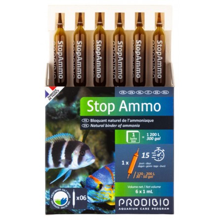 Stop Ammo neutraliza el amoníaco y limita la producción de nitritos. Este producto se puede utilizar en aguas de transporte de peces, así como en aguas de acuarios.