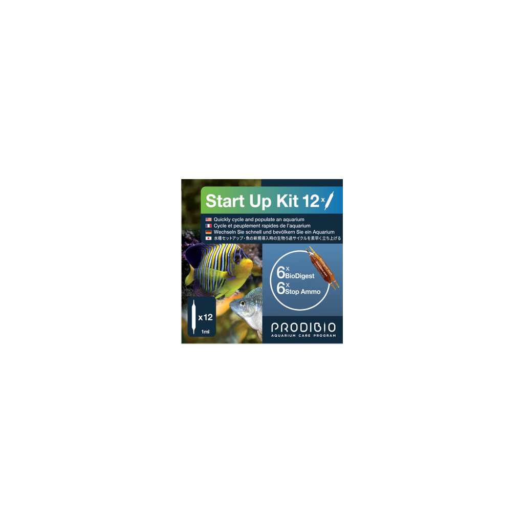 La versión Start Up de 12 ampollas corresponde a la gama estándar para acuarios de 180 a 360 litros . Contiene 6 ampollas de BioDigest Start y 6 ampollas de Stop Ammo Start. Este envase ha sido diseñado para garantizar una puesta en marcha uniforme en acuarios de mayor tamaño, manteniendo un uso sencillo y preciso.