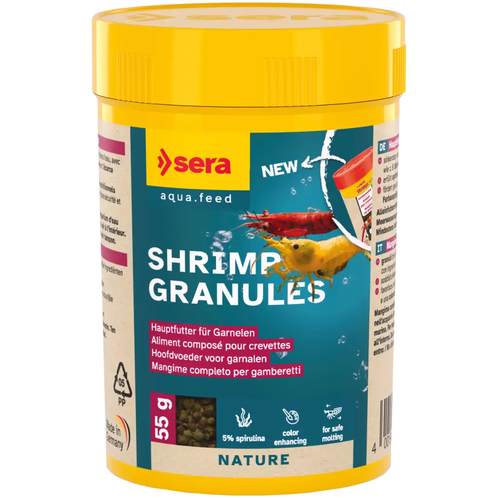 Características : 100 ml (≈55 g) — Ref. 00554 — Alimento completo para camarones — Gama “Nature” (sin colorantes ni conservantes) — Gránulos que se hunden de larga duración.