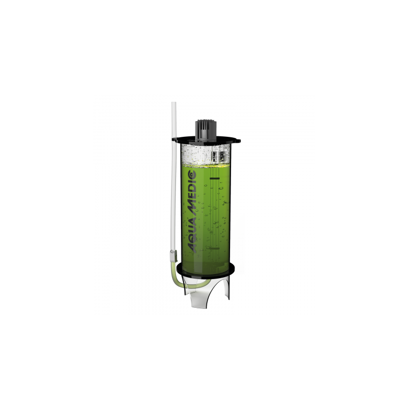 El reactor ligero de plancton II está equipado con dos conexiones para el suministro simultáneo de aire y CO2. El contenido de CO2 puede incrementarse dependiendo del pH en caso de altos requerimientos de plancton. La tapa tiene un alojamiento para una sonda de pH. Sin embargo, en caso de necesidades normales, no es necesario añadir CO2 adicional. Para facilitar el muestreo parcial de plancton, en la tapa de la carcasa se encuentra una manguera con una pinza dosificadora y un soporte. Es posible cultivar algas marinas o de agua dulce, fitoplancton y zooplancton.