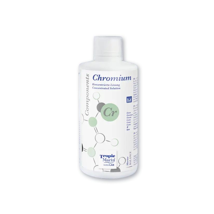 El cromo es un oligoelemento presente de forma natural en el agua de mar en concentraciones muy bajas (0,1-0,3 μg/l). Desempeña un papel crucial en el metabolismo de los organismos marinos, particularmente en la asimilación de lípidos y glucosa. Una deficiencia puede provocar un crecimiento lento de los corales y otros invertebrados marinos. Con Tropic Marin Components Chrome, garantiza un equilibrio óptimo y preserva la vitalidad de su arrecife.