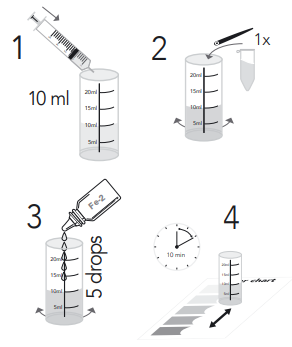 Ce test a été pensé pour rester pratique à utiliser, même dans le cadre d’une routine d’entretien régulière. Il suffit de prélever 10 ml d’eau, d’ajouter ensuite une cuillère de poudre issue du tube à bouchon rouge, puis de bien agiter l’éprouvette. Après cela, il faut verser 5 gouttes du réactif Fe-2 et secouer à nouveau. Une fois la préparation terminée, il suffit d’attendre 10 minutes avant de procéder à la lecture. Le résultat se détermine ensuite à l’aide du nuancier fourni. Cette méthode reste claire, rapide à comprendre et agréable à reproduire, ce qui rend le suivi du fer beaucoup plus simple sur la durée.
