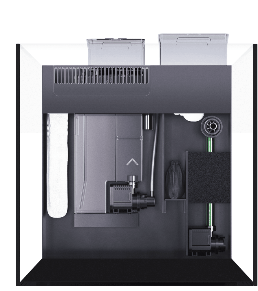 Le Desktop Cube 75 L ne se contente pas d’être joli. Il a aussi été conçu pour être pratique au quotidien grâce à sa décantation arrière intégrée et à sa filtration multi-niveaux. Cette configuration permet de conserver un affichage principal net, sans surcharger l’espace visible du bac avec trop d’équipements. La partie arrière accueille les éléments de filtration dans une logique simple et efficace, ce qui aide à garder un aquarium propre, organisé et agréable à gérer. Le bac est livré avec un compartiment dédié à l’écumeur ou aux médias biologiques, du charbon REEF-SPEC Red Sea, une éponge piège-bulles ainsi qu’un micron bag de 225 microns. Cela permet de bénéficier dès le départ d’une filtration mécanique et chimique complète, ce qui est un vrai plus pour démarrer sur une base cohérente et qualitative.