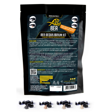 BEA Aequilibrium Kit objedinjuje cijeli AEQUILIBRIUM protokol u jednoj kutiji: A + E + Z + PRO , koja se sastoji od 40 kapsula spremnih za upotrebu koje se mogu otvoriti . Ideja je jednostavna: ponuditi sveobuhvatan i sinergijski pristup biološkom upravljanju hranjivim tvarima i održavanju stabilne mikrobne ravnoteže u morskim akvarijima. Konzorciji morskih mikroba, organo-mineralna matrica, enzimi , elementi u tragovima , hranjive tvari, metabolički stimulansi i specifični izvori ugljika : sve je uključeno kako bi se podržala nitrifikacija, denitrifikacija i transformacija organskog otpada. Redovitom upotrebom, komplet pomaže da akvarij ostane čist, stabilan i manje osjetljiv na probleme poput cijanobakterija, dinoflagelata, algi ili mulja.