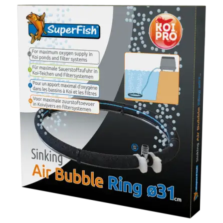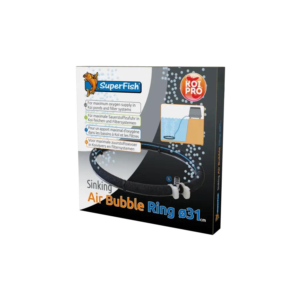 SuperFish tonući prsten za mjehuriće zraka Ø31 cm idealan je partner za osiguravanje homogene i snažne oksigenacije u velikim ribnjacima . Dizajniran s visokokvalitetnom poroznom cijevi i otežanim prstenom od nehrđajućeg čelika , osigurava redovitu difuziju mikromjehurića, a istovremeno ostaje čvrsto na dnu vode. Savršen za koi ribnjake , uzgojne spremnike , komore s plutajućim medijima ili karantenske spremnike , ovaj prsten za mjehuriće nudi izvrsnu difuzijsku površinu promjera preko 31 cm. Lako se spaja na SuperFish ojačanu zračnu cijev od 8-12 mm. Jednostavan, robustan i ultra učinkovit dodatak za očuvanje zdravlja vaših riba i kvalitete vode.