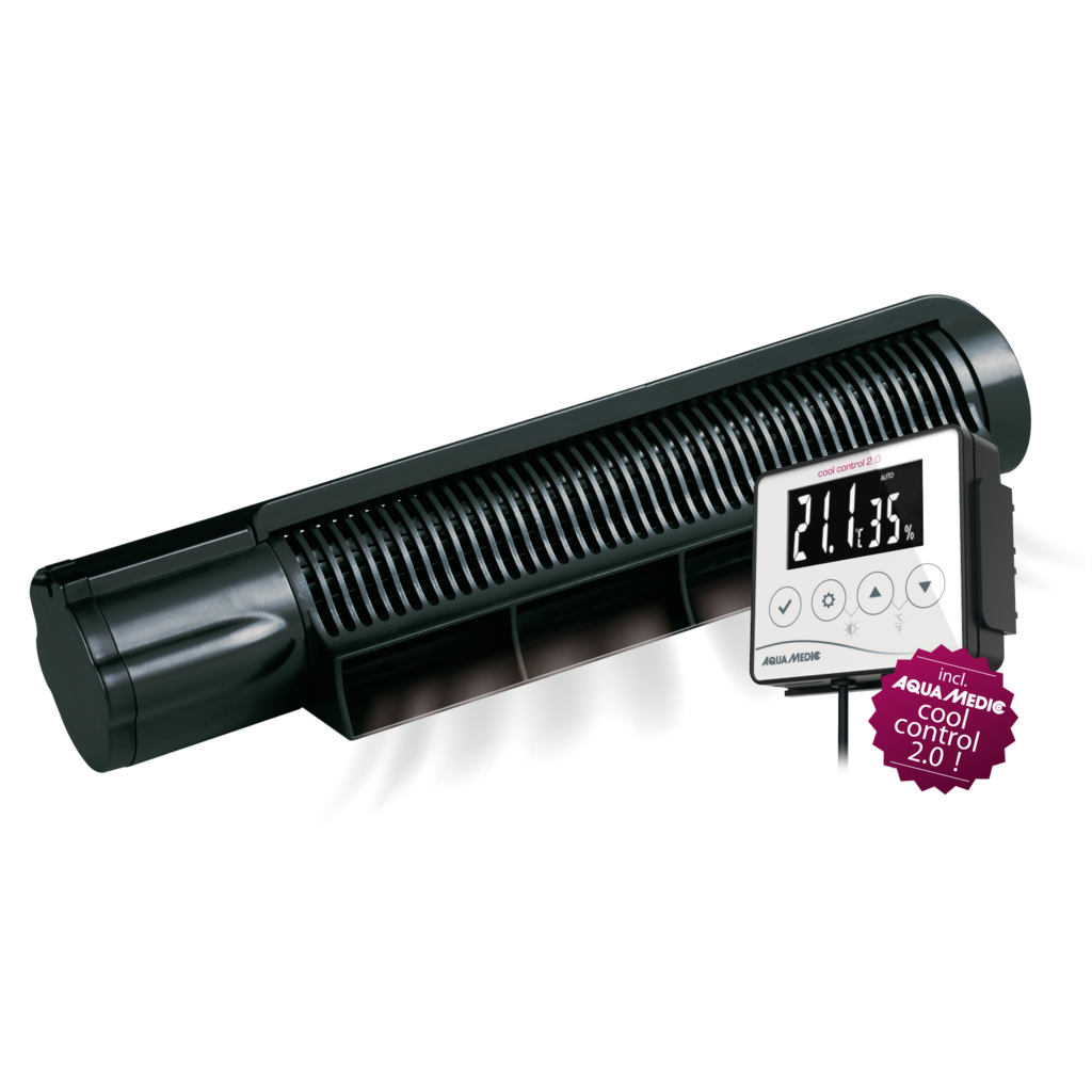 Aqua Medic cool control je digitalni uređaj za mjerenje i podešavanje za upravljanje ventilatorima. Regulator temperature “cool control” sa zaslonom osjetljivim na dodir omogućuje vam upravljanje ventilatorima od 12 ili 24 volta opremljenim šupljim utikačem (5,5 mm x 2,1 mm). Preciznost prebacivanja je 0,5°C.