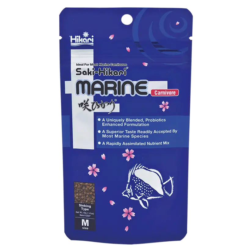 Saki-Hikari Marine Carnivore vrhunska je prehrana posebno osmišljena da zadovolji potrebe morskih riba mesojeda i svejeda . S visokim udjelom kvalitetnih bjelančevina , ova je uravnotežena hrana posebno atraktivna i inspirirana je prirodnom prehranom morske ribe. Uključujući Hikari-Germ, jedinstveni probiotik, osigurava bolju probavu i smanjuje otpad za 40%, pomažući u održavanju čistoće. i zdravu vodu u vašem akvariju. Zahvaljujući spužvastoj teksturi i sporom otapanju, granule se postupno spuštaju, omogućujući svim ribama lako hranjenje, čak i onima koje je najteže hraniti u zatočeništvu.