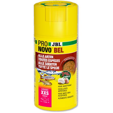 Pronovo bel Grano XXS iz JBL-a je mala osnovna hrana u kuglicama za sve akvarijske ribe od 1 do 3 cm. Verzija na klik omogućuje dozirano hranjenje izravno iz kutije.