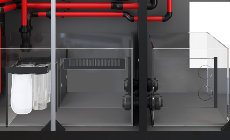 Integrirani hvatač mjehurića sprječava povratak mikromjehurića u glavni spremnik. Dodatni odjeljak može primiti rashladnu jedinicu, kontrolere ili drugu dodatnu opremu.