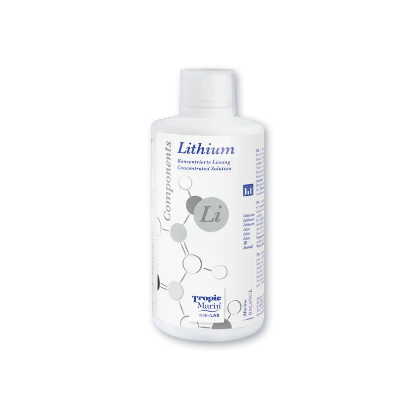 Tropic Marin Components Lithium je dizajniran za sigurnu i učinkovitu dopunu. Njegova formulacija visoke čistoće jamči brzu integraciju u vodu vašeg akvarija bez nečistoća. Zahvaljujući svom stabiliziranom sastavu , osigurava točnu količinu litija koja je potrebna bez rizika od predoziranja , pod uvjetom da se slijede preporuke.