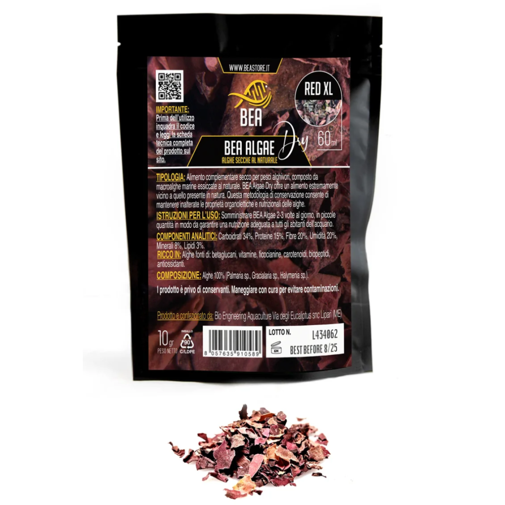 BEA - Alghe Rosse Essiccate XL - 10 g è un alimento complementare a base di macroalghe marine essiccate al 100% naturalmente , studiato per pesci algofili come i pesci chirurgo e altri pesci pascolatori di barriera. La sua caratteristica unica? Un contenuto proteico fino al 30% , superiore a quello delle alghe verdi, con aminoacidi essenziali per supportare la vitalità. Ricco di antiossidanti naturali , ficobiliproteine e vitamina C , contribuisce all'equilibrio generale e a colori vivaci. I polisaccaridi solforati presenti nelle alghe rosse contribuiscono a supportare il sistema immunitario e il benessere digestivo. Il pratico formato XL consente un'alimentazione generosa e naturale.