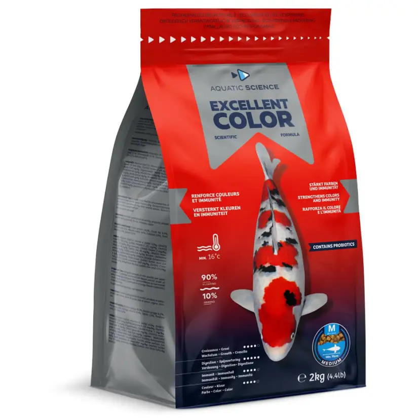 Oltre a ravvivare le tonalità rosse, gialle o arancioni delle vostre koi, questo alimento svolge anche un ruolo essenziale per la loro salute generale . Arricchito con probiotici e vitamine essenziali , Excellent Color supporta il sistema immunitario, consentendo ai pesci di affrontare meglio le aggressioni esterne e di riprendersi più velocemente dopo il trattamento. I risultati sono visibili fin dalle prime settimane: pesci più vivaci, più colorati e in forma migliore.