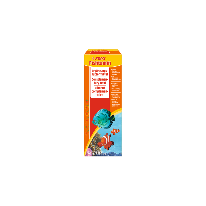 L'integratore vitaminico per una maggiore vitalità, Fishtamin , è un alimento complementare studiato per tutti i pesci d'acqua dolce e salata Prodotto mediante un processo speciale, questo concentrato multivitaminico emulsionato integra in modo efficace e sicuro la loro dieta fornendo tutte le vitamine essenziali . Versato sul cibo o nell'acqua, Fishtamin colma le lacune nutrizionali e previene le carenze. Rafforza le difese naturali, migliora la salute e la vitalità dei pesci. Il suo utilizzo è particolarmente benefico in casi di stress, malattie, per i giovani pesci e per favorire la riproduzione.