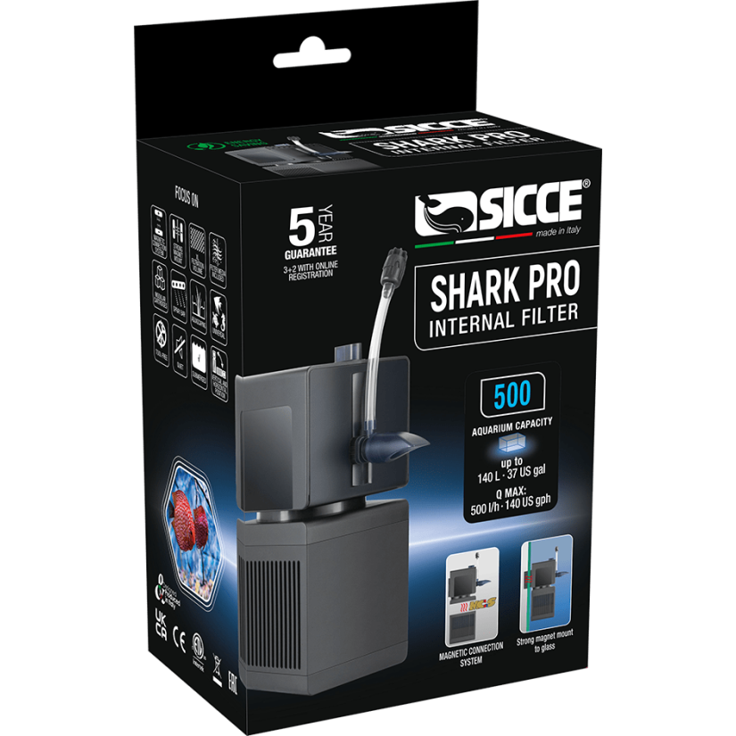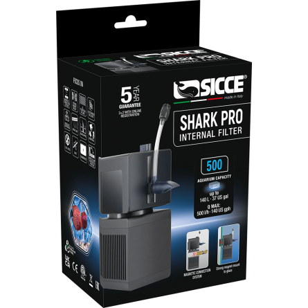 Il SICCE Shark PRO 500 è un filtro interno ideale per acquari fino a 140 litri . Compatto, potente e il suo design intelligente ti consente di installarlo verticalmente o orizzontalmente a seconda della configurazione del tuo acquario. Con una portata regolabile fino a 500 l/h , questo schiumatoio garantisce un'ossigenazione ottimale dell'acqua. Il suo innovativo attacco magnetico facilita l'installazione e riduce al minimo le vibrazioni, rendendone il funzionamento pressoché silenzioso. Progettato per essere flessibile , Shark PRO 500 può ospitare fino a due cartucce aggiuntive per aumentare la capacità di filtrazione.