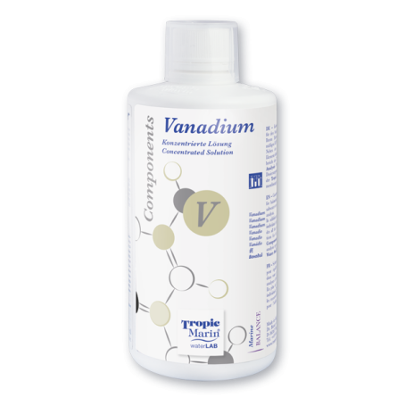 Il vanadio svolge un ruolo fondamentale nello sviluppo e nella salute dei coralli, attivando enzimi essenziali per il loro metabolismo. Negli acquari la sua concentrazione naturale è molto bassa, compresa tra 3 e 5 µg/L. L'assunzione controllata di Tropic Marin Components aiuta a prevenire le carenze e a ottimizzare la crescita e la colorazione dei coralli.