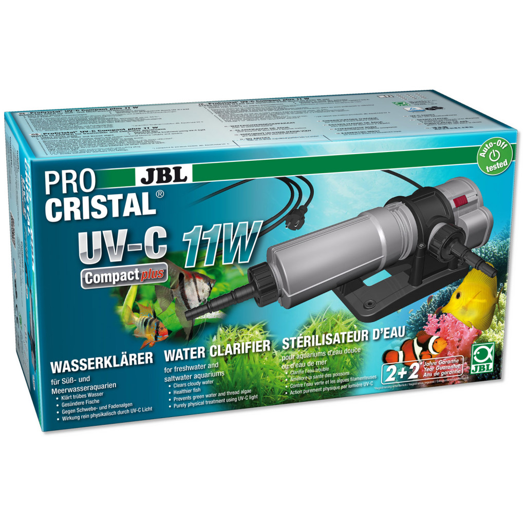 JBL ProCristal Compact UV-C 11W è uno sterilizzatore UV da 11 watt per acquari d'acqua dolce o salata fino a 800 litri . Fornirà acqua limpida e sana rimuovendo rapidamente ed efficacemente la torbidità verdastra e biancastra. 2 anni di garanzia.