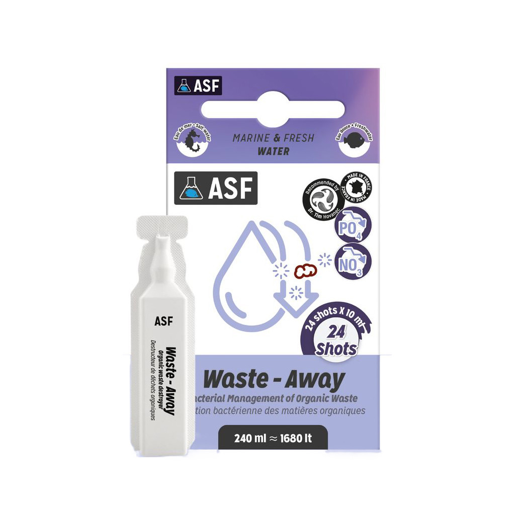 Of het nu gaat om een klein beplant zoetwateraquarium of een groot rifaquarium, Waste-Away past zich aan elke configuratie aan . Het is perfect als basisbehandeling, maar ook na een grondige reiniging om de omgeving te stabiliseren. De verpakking in 24 doses van 10 ml is superpraktisch: geen verspilling, geen overdosering.