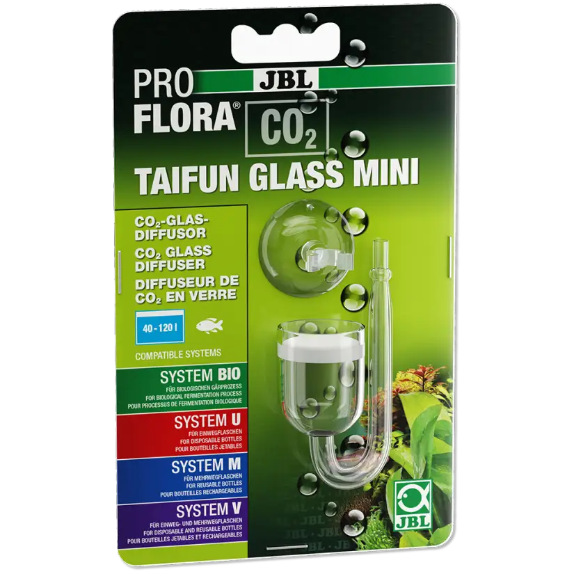 JBL-Proflora CO2 Taifun Glass Mini is een mini CO2-diffusor voor aquaria van 40 tot 120 liter . Het combineert elegantie en efficiëntie en biedt een optimale oplossing voor het oplossen van CO2 in uw aquariumwater. Het is ontworpen om de perfecte groei van uw waterplanten te bevorderen , dankzij een gespecialiseerd keramisch membraan dat extreem fijne CO2-belletjes produceert . De installatie is eenvoudig en praktisch, met een clip-zuignap voor een veilige bevestiging aan het aquariumglas.