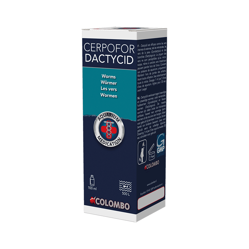 Colombo Cerpofor Dactycid 100ml is de perfecte oplossing om interne en externe parasieten van zoetwatervissen te bestrijden . Deze behandeling is geformuleerd om effectief te zijn tegen verschillende soorten wormen, waaronder nematoden, huidwormen (Gyrodactylus) en kieuwwormen (Dactylogyrus). Deze behandeling werkt snel en respecteert de balans van het aquarium. Gemakkelijk in gebruik en veilig voor vissen, planten en het biologische filter, het biedt volledige en langdurige bescherming. Met een fles van 100 ml kunt u tot 500 liter water behandelen, waardoor u verzekerd bent van een gezonde, ongediertevrije omgeving.