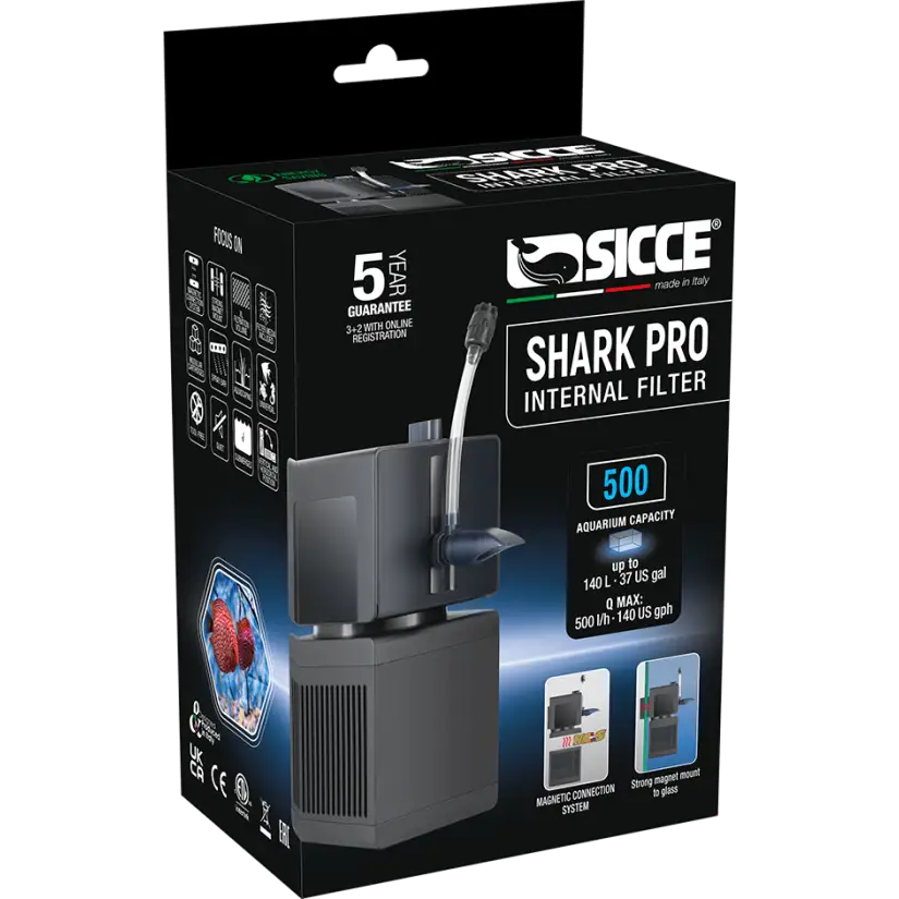 De SICCE Shark PRO 500 is een binnenfilter ideaal voor aquaria tot 140 liter . Compact, krachtig en dankzij het intelligente ontwerp kunt u hem verticaal of horizontaal installeren, afhankelijk van de configuratie van uw aquarium. Met een regelbaar debiet tot 500 l/u zorgt deze skimmer voor een optimale oxygenatie van het water. De innovatieve magnetische bevestiging vergemakkelijkt de installatie en minimaliseert trillingen, waardoor de werking vrijwel geruisloos is. De Shark PRO 500 is ontworpen om flexibel te zijn en biedt plaats aan maximaal twee extra cartridges om de filtratiecapaciteit te vergroten.