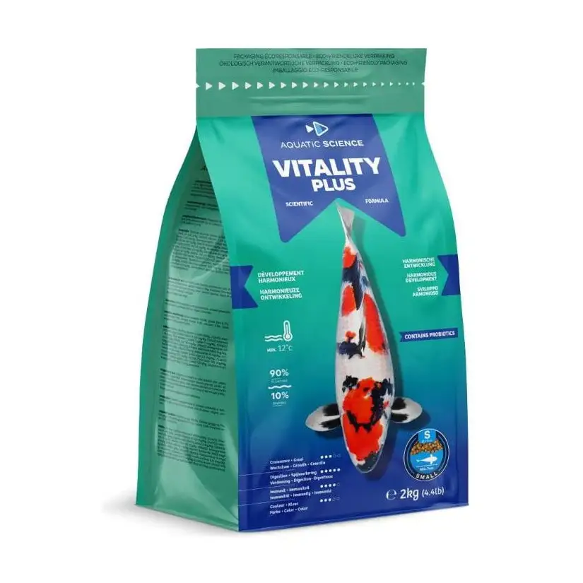 Met AQUATIC SCIENCE Vitality Plus Small krijgen uw vijvervissen een complete, zeer voedzame en licht verteerbare voeding . Speciaal voor koi en siervissen vanaf 7 cm . Deze 2 tot 3 mm dikke korrelvoeding bevordert de groei, vitaliteit en intensiveert de natuurlijke kleuren. Dankzij de samenstelling verrijkt met mariene proteïnen, vitaminen en probiotica versterkt het de immuniteit en beperkt het de watervervuiling. Deze vakkundig samengestelde mix wordt door professionele fokkers geprezen vanwege de indrukwekkende resultaten. Door meerdere kleine maaltijden per dag te verstrekken, optimaliseert u de opname van voedingsstoffen en bevordert u het dagelijkse welzijn van uw watergenoten.