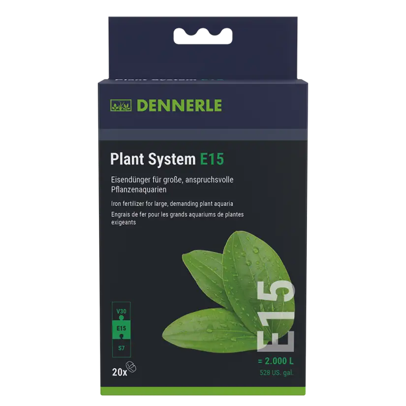 E15 plantensysteem ijzermeststof voorziet alle aquariumplanten van tweewaardige voeding ijzer II die ze direct kunnen gebruiken en zorgt voor een prachtige frisse groene kleur. IJzer is van het allergrootste belang voor alle aquariumplanten. Het is noodzakelijk voor de vorming van vitale groene bladeren. Zonder groen blad kan de plant geen fotosynthese uitvoeren. IJzergebrek manifesteert zich onmiddellijk: jonge bladeren zien er bleek en gelig uit (ijzerchlorose).