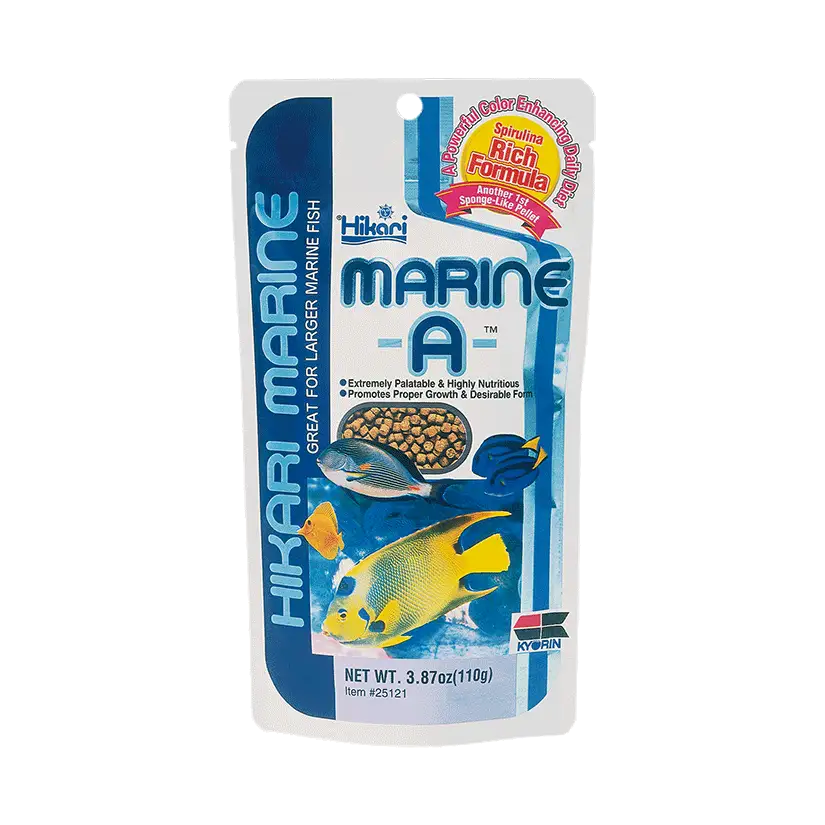 HIKARI Marine A 110g is het favoriete voer voor grote zeevissen , zowel herbivoren als alleseters. Met zijn sponsachtige structuurkorrels imiteert dit voer de voedingsomstandigheden in een natuurlijke omgeving en garandeert het een gemakkelijke en natuurlijke opname. Rijk aan pure spirulina, algen en Omega 3, ondersteunt Marine A een gezonde groei en intensiveert de natuurlijke kleur van vissen. Door de toevoeging van mosselextract is dit voer zelfs voor de meest kieskeurige vis nog aantrekkelijker. Het is goed verteerbaar en helpt de hoeveelheid afval in het aquarium te verminderen, terwijl het maximale voedingsstoffen levert.