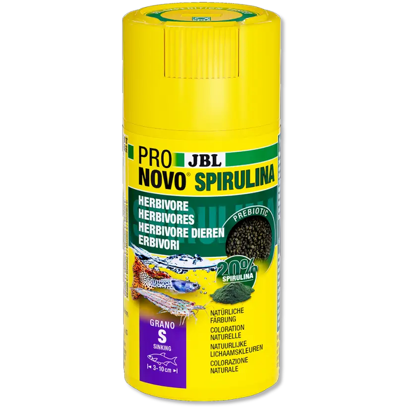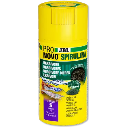 JBL - Pronovo Spirulina Grano S 100ml is een aanvullend voer in granulaat voor alle zoet- en zeewatervissen van 3 tot 10 cm. Dankzij een hoog percentage spirulina (20%) is het ideaal voor plantenetende of omnivore vissen.