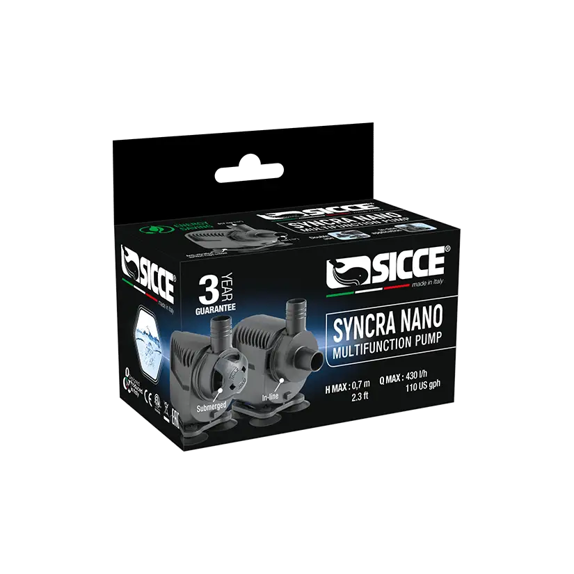 De Syncra NANO pomp is een kleine waterpomp van 430 l/u . Het brengt alle kwaliteiten van de SYNCRA-lijn samen in de kleinste en meest compacte pomp op de markt. Hij is uitgerust met een mannelijke uitlaat en zuignappen, waardoor het een uitstekende circulatiepomp is voor elke nano- of picoreef-tank.
