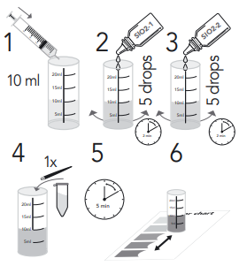 Este teste foi desenvolvido para ser fácil de usar, mesmo para monitoramento regular. Primeiro, coloque 10 ml de água , adicione 5 gotas do reagente SiO2-1 , agite o tubo de ensaio e aguarde 2 minutos . Em seguida, adicione 5 gotas do reagente SiO2-2 , agite novamente e aguarde mais 2 minutos . Depois, adicione uma colher de pó de silicato e agite mais uma vez. Após uma espera final de 5 minutos , o resultado pode ser lido utilizando a tabela de cores inclusa. O procedimento é claro, passo a passo e fácil de integrar à rotina diária, sem parecer desnecessariamente complicado.