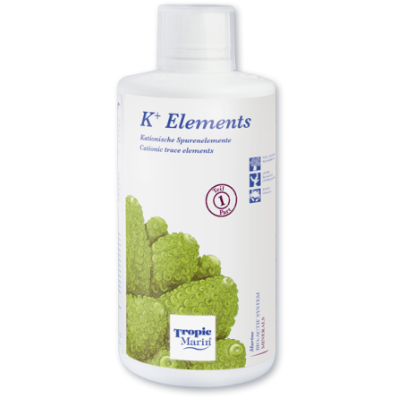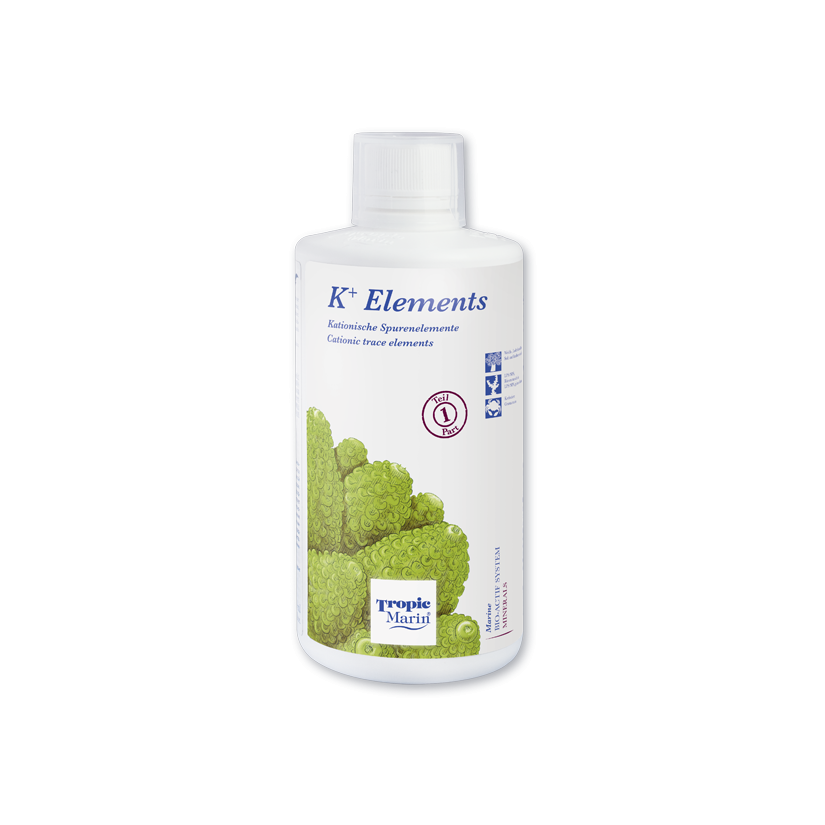 Tropic Marin ® K + ELEMENTS e A - ELEMENTS foram desenvolvidos após análises científicas realizadas ao longo de muitos anos em água e amostras de esqueletos de corais e contêm oligoelementos catiônicos e aniônicos em dosagens ideais e perfeitamente adequados para aquários de recife.