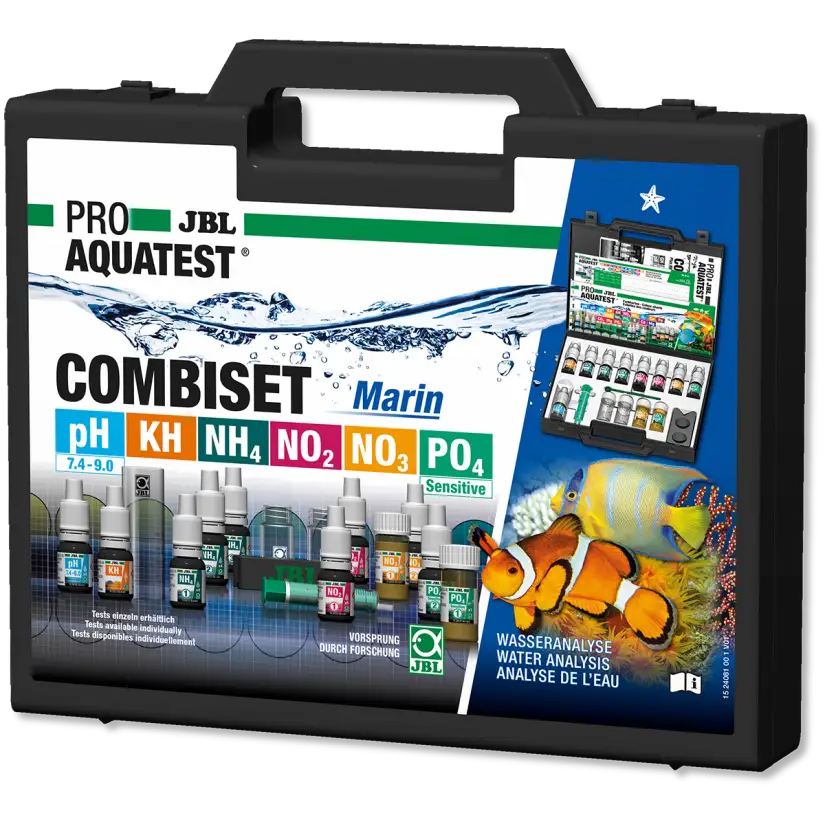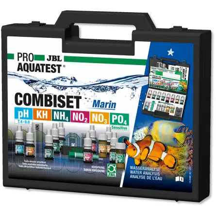 A caixa ProAquaTest CombiSet Marine da JBL é uma caixa completa que permite controlar com facilidade e precisão os principais parâmetros da água do seu aquário marinho. Graças aos seus 6 testes, você pode medir pH, dureza de carbonatos (KH), níveis de amônio/amônia, nitritos, nitratos e fosfatos. A caixa contém frascos de reagentes resistentes a crianças, é resistente à água e oferece recargas disponíveis separadamente.