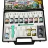 A caixa contém tudo o que você precisa para realizar seus testes: 11 reagentes, um bloco comparador, três tubos de ensaio, uma seringa, uma colher medidora, tabelas de cores, fichas de análise e instruções detalhadas de uso. As recargas de reagentes também estão disponíveis separadamente, permitindo que você estenda o uso do seu estojo sem precisar adquirir um kit novo completo.