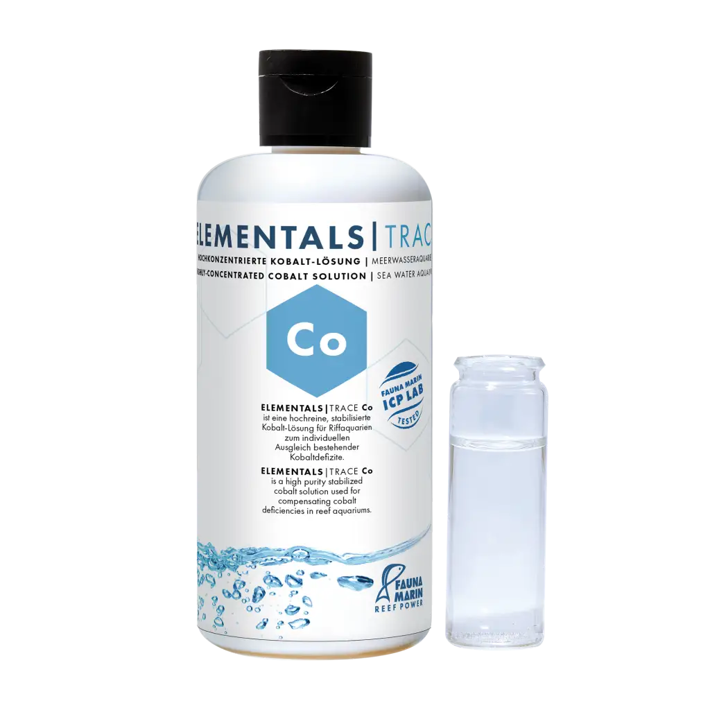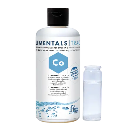 Elementals Co podjetja Fauna Marin je koncentrirana kobaltova raztopina za morske akvarije, ki omogoča individualno uravnoteženje obstoječih pomanjkanj kobalta.