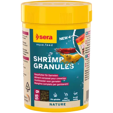 Značilnosti : 100 ml (≈55 g) — Ref. 00554 — Popolna hrana za kozice — Linija »Nature« (brez barvil in konzervansov) — Dolgotrajno potapljajoče se granule.