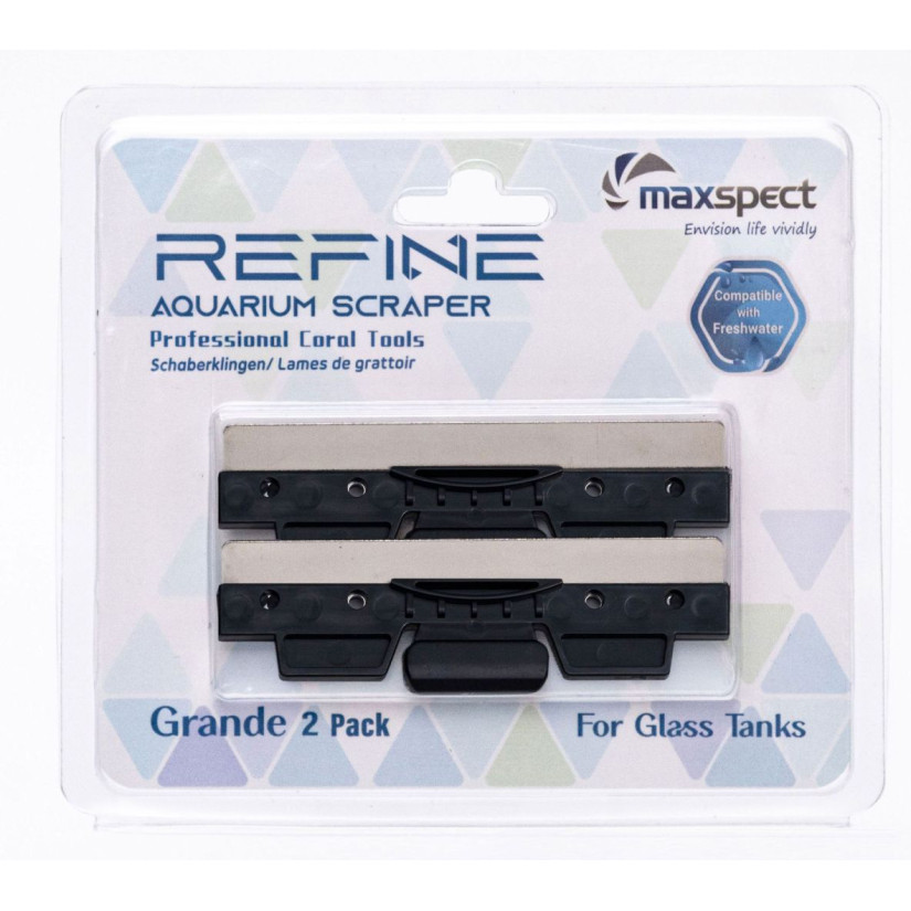 Paket 2 nadomestnih rezil iz nerjavečega jekla za strgalo za akvarij Maxspect Refine Grande. Ta rezila se lahko uporabljajo samo za steklene akvarije.